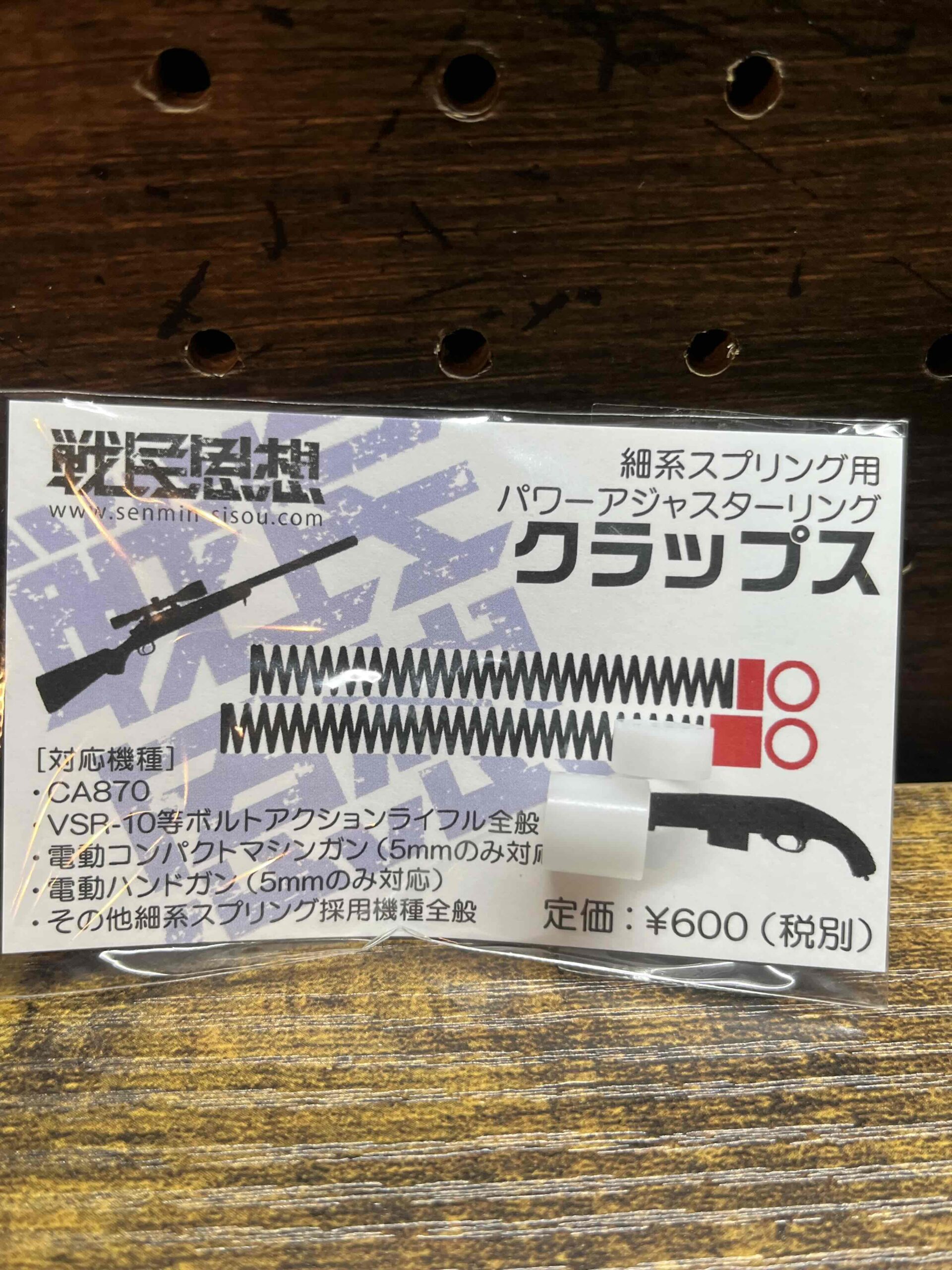 メインスプリングをかさ上げして初速の調整ができます。材質に自己潤滑性に優れるPOMを使用しているため、スプリングのねじれを程よく逃がします。5mm/10mmのセットで、基本3パターンの調整が可能です。リングを削ればより細かな調整も可能です。CA870のメインスプリングはいわゆる「細系」規格のため、クラップスは・APS2・VSR-10・L96・コンパクト電動ガン・電動ハンドガンなどにも転用できます。ただし機種によってはスプリングの可動域に限界がありますので、長いクラップスを入れるとスプリングが縮みきって密着する恐れがあります。組み込みの際はご注意ください