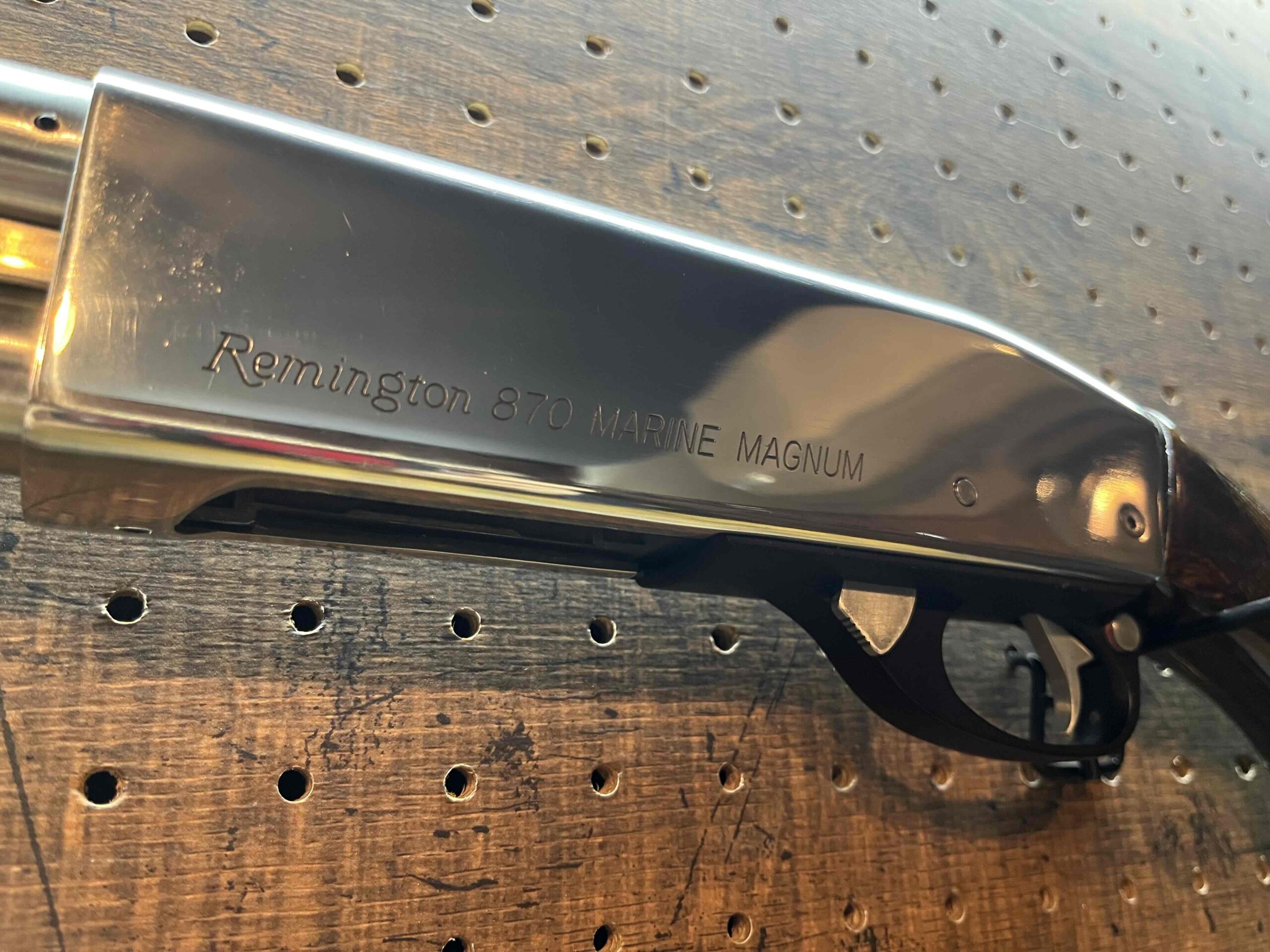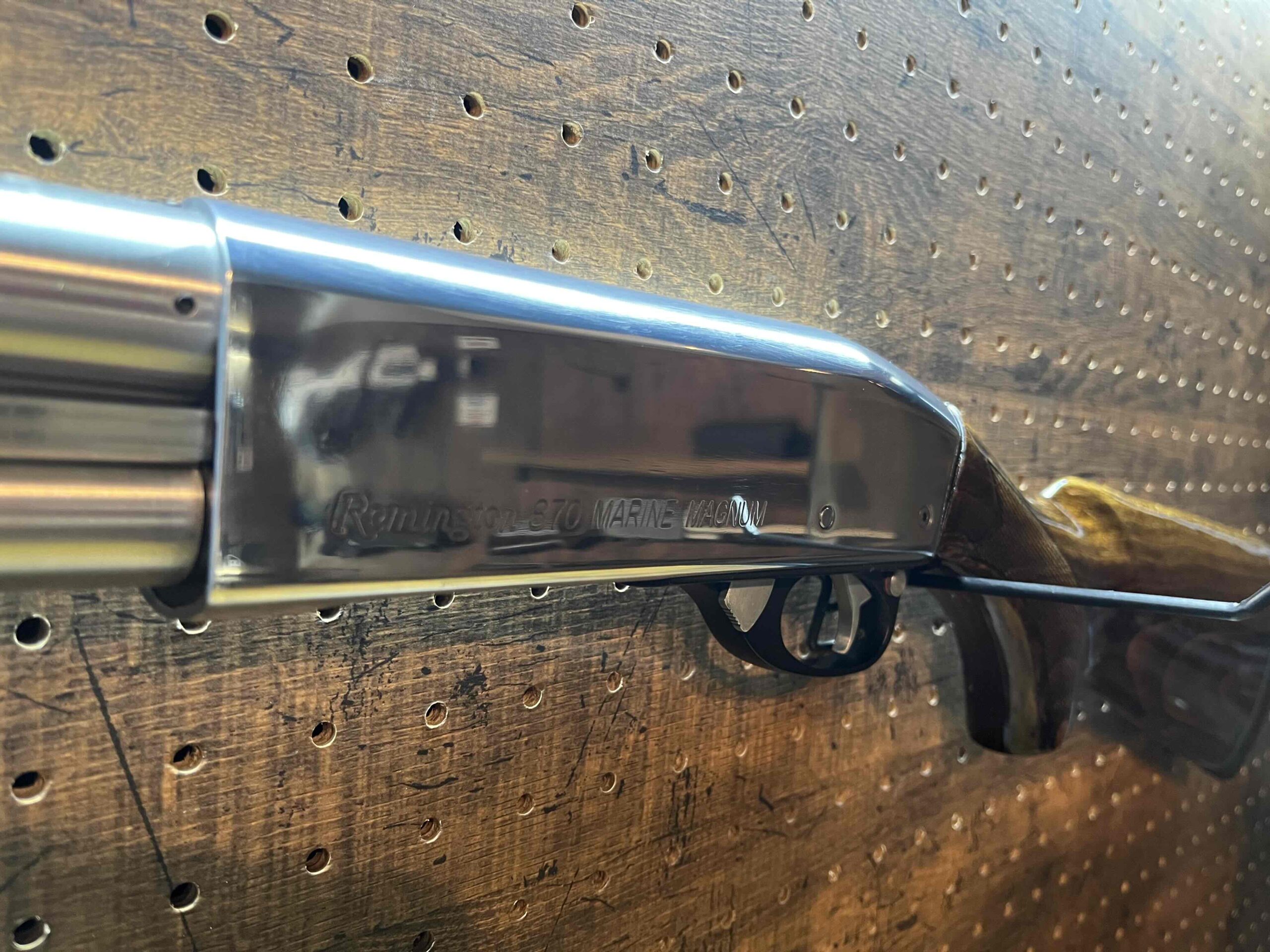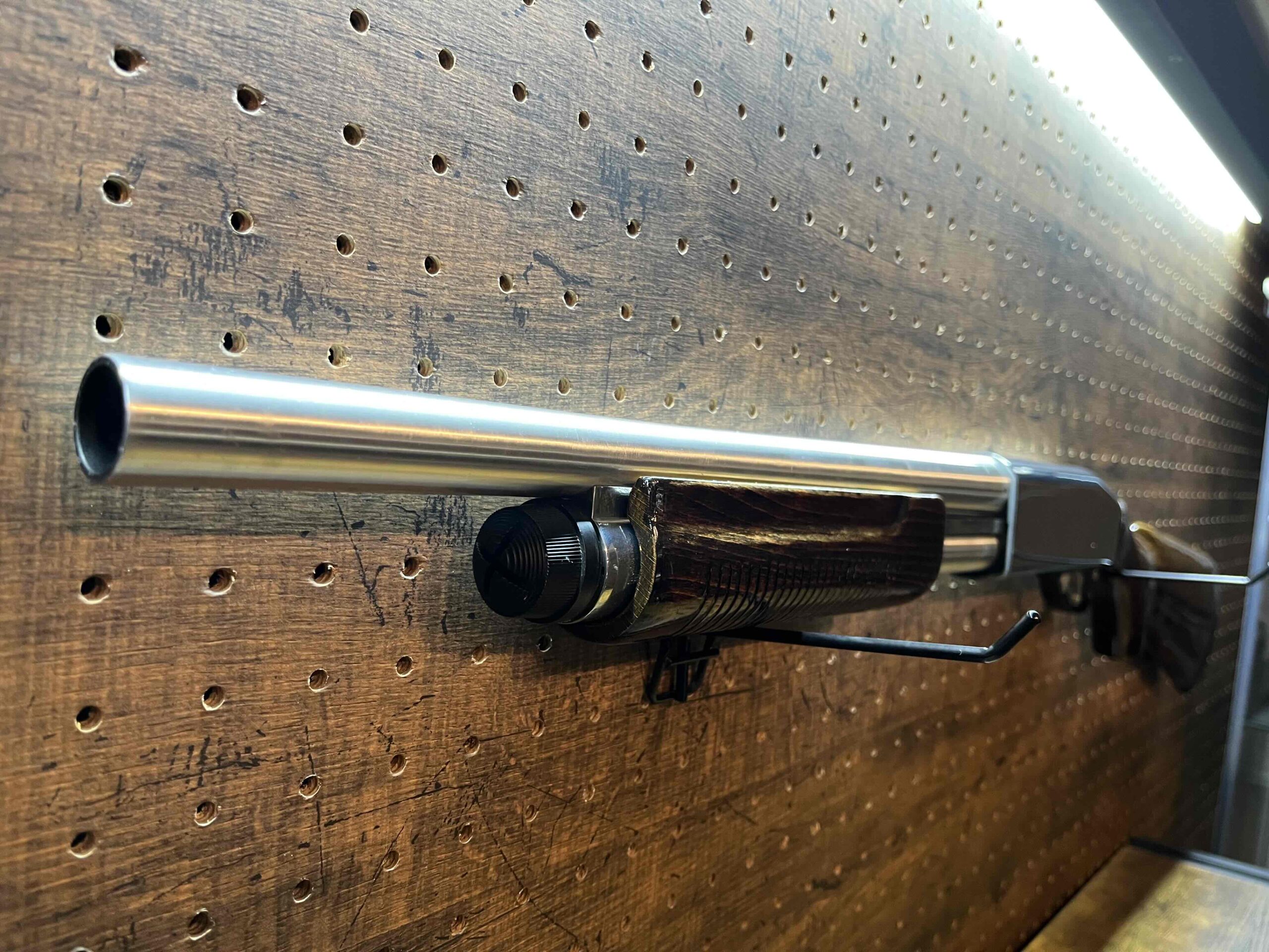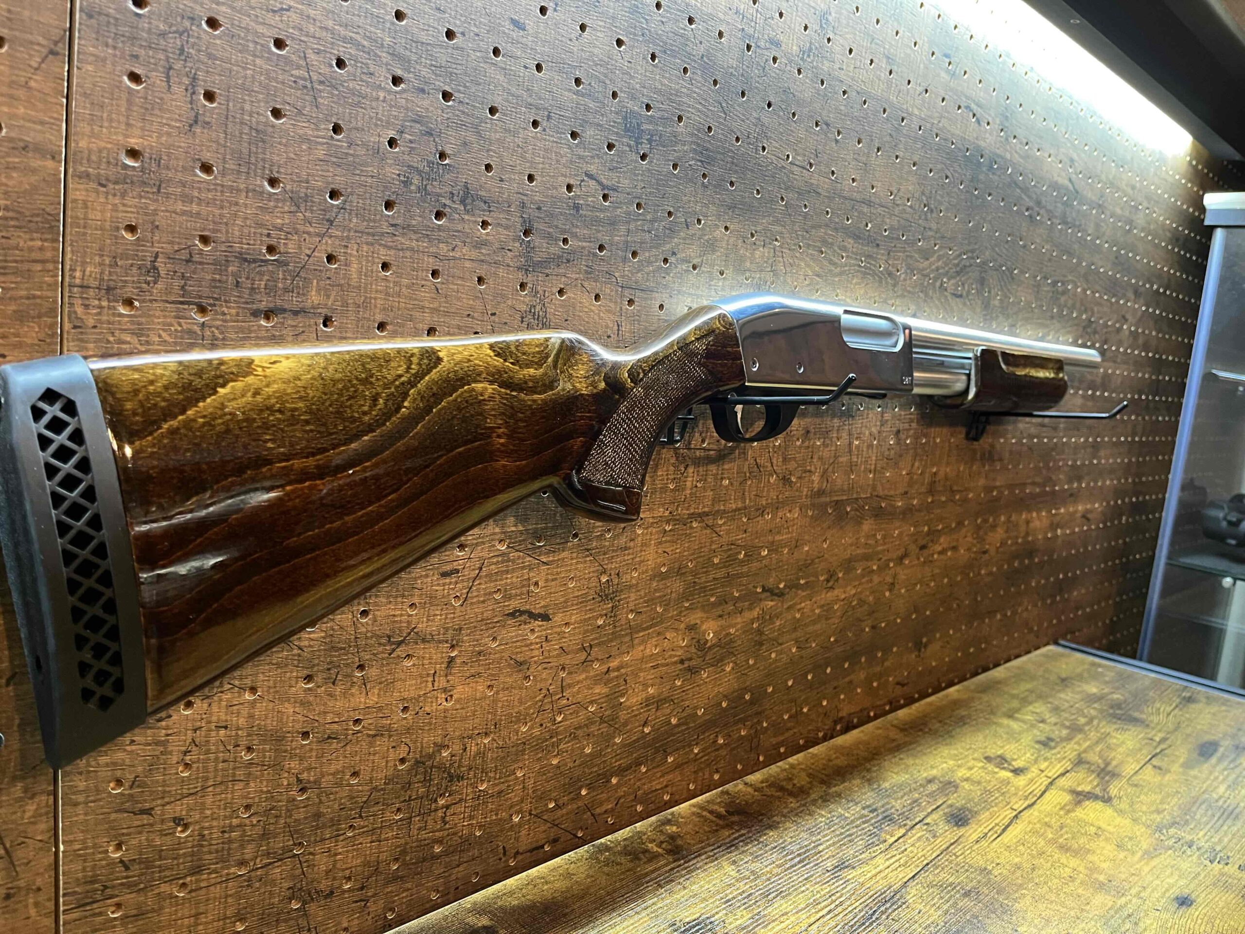 当店では内部のメンテナンスとバレルの加工により性能向上をすることを基本に外装のアップデートに力を入れております。リアルウッド、フルメタルの構成は国内には無いパーツが標準で装備されており、ウッドは完全剥離の後にオイルステインによる塗装とウレタンクリアを丁寧に塗ることにより美しい仕上がりとなりました。フレーム及び各部のメタルパーツは今回のモデルでは特に拘り、実銃の写真を元にカラーリングを実銃と同じに致しました。細かいところですが、ノーマルでは黒色のトリガー、セーフティラッチ、シェルリリースレバー、フレーム固定ボルト及びロックピンを磨き金属本来の美しい色に変更、アウターバレル及びシェルリザーブパイプは全て磨き上げた上で金属用コーティングを塗装してあります。